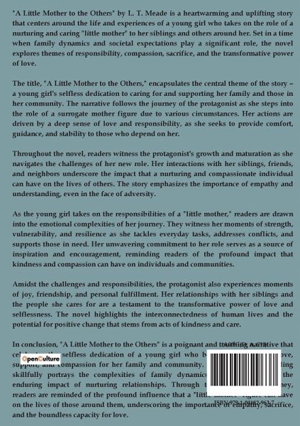 "A Little Mother to the Others" by L. T. Meade is a heartwarming and uplifting story that centers around the life and experiences of a young girl who takes on the role of a nurturing and caring "little mother" to her siblings and others around her. Set in a time when family dynamics and societal expectations play a significant role, the novel explores themes of responsibility, compassion, sacrifice, and the transformative power of love. The title, "A Little Mother to the Others," encapsulates the central theme of the story ¿ a young girl's selfless dedication to caring for and supporting her family and those in her community. The narrative follows the journey of the protagonist as she steps into the role of a surrogate mother figure due to various circumstances. Her actions are driven by a deep sense of love and responsibility, as she seeks to provide comfort, guidance, and stability to those who depend on her. Throughout the novel, readers witness the protagonist's growth and maturation as she navigates the challenges of her new role. Her interactions with her siblings, friends, and neighbors underscore the impact that a nurturing and compassionate individual can have on the lives of others. The story emphasizes the importance of empathy and understanding, even in the face of adversity. As the young girl takes on the responsibilities of a "little mother," readers are drawn into the emotional complexities of her journey. They witness her moments of strength, vulnerability, and resilience as she tackles everyday tasks, addresses conflicts, and supports those in need. Her unwavering commitment to her role serves as a source of inspiration and encouragement, reminding readers of the profound impact that kindness and compassion can have on individuals and communities. Amidst the challenges and responsibilities, the protagonist also experiences moments of joy, friendship, and personal fulfillment. Her relationships with her siblings and the people she cares for are a testament to the transformative power of love and selflessness. The novel highlights the interconnectedness of human lives and the potential for positive change that stems from acts of kindness and care. In conclusion, "A Little Mother to the Others" is a poignant and touching narrative that celebrates the selfless dedication of a young girl who becomes a beacon of love, support, and compassion for her family and community. L. T. Meade's storytelling skillfully portrays the complexities of family dynamics, societal roles, and the enduring impact of nurturing relationships. Through the protagonist's journey, readers are reminded of the profound influence that a "little mother" figure can have on the lives of those around them, underscoring the importance of empathy, sacrifice, and the boundless capacity for love.