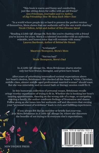 In A Little Off. Always On., Mora Brinkman shares stories only her best friend, therapist, and priest have heard. After years of prioritizing internalized societal expectations above her heart's desires, Brinkman's life checked all the boxes a "white, Christian, middle-class, almost middle-aged professional married woman" should want. But she was miserable, and no sound bath or therapy session could fix it. In this humorous collection of personal essays, Brinkman recalls cringe-worthy experiences of trying to fit in. Whether she is booking her boss's tanning appointments, dancing on the wrong side of a stage, or navigating starting a family, the author confronts feelings of frustration and shame. Follow along as she tunes into her authentic self and discovers that owning your "personal brand of weirdness" leads to rich and fulfilling experiences. If you always felt like an outsider or briefly lost your way, join Mora Brinkman in A Little Off. Always On. where she discovers the benefits of not trying to fit everyone else's expectations.