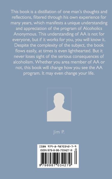 This book is a distillation of one man's experience and reflections, refined over decades, which manifests a unique understanding and appreciation of the program of Alcoholics Anonymous. The casual approach is sometimes lighthearted, but never loses sight of the serious consequences of alcoholism. This interpretation of AA is not for everyone, but if it works for you, you will know it. Whether you are a member of AA or not, this book will change how you see the AA program. It may even provide you with a blueprint for living at peace in an increasingly chaotic world.