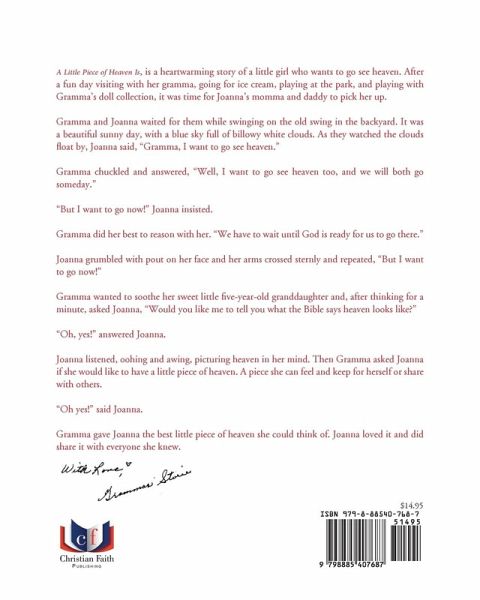 A Little Piece of Heaven Is is a heartwarming story of a little girl who wants to go see heaven. After a fun day visiting with her gramma, going for ice cream, playing at the park, and playing with Gramma's doll collection, it was time for Joanna's momma and daddy to pick her up. Gramma and Joanna waited for them while swinging on the old swing in the backyard. It was a beautiful sunny day, with a blue sky full of billowy white clouds. As they watched the clouds float by, Joanna said, "Gramma, I want to go see heaven." Gramma chuckled and answered, "Well, I want to go see heaven too, and we will both go someday." "But I want to go now!" Joanna insisted. Gramma did her best to reason with her. "We have to wait until God is ready for us to go there." Joanna grumbled with pout on her face and her arms crossed sternly and repeated, "But I want to go now!" Gramma wanted to soothe her sweet little five-year-old granddaughter and, after thinking for a minute, asked Joanna, "Would you like me to tell you what the Bible says heaven looks like?" "Oh, yes!" answered Joanna. Joanna listened, oohing and awing, picturing heaven in her mind. Then Gramma asked Joanna if she would like to have a little piece of heaven. A piece she can feel and keep for herself or share with others "Oh yes!" said Joanna. Gramma gave Joanna the best little piece of heaven she could think of. Joanna loved it and did share it with everyone she knew.