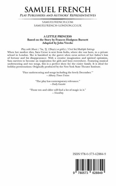 When her mother dies, Sara Crewe is sent from India, where she was born, to a private school in London. She is banished to the garret when news arrives of her fathers loss of fortune and his disappearance. With a creative imagination and spirited optimism, Sara survives to become an inspiration for girls and boys everywhere. Featuring musical underscoring and two songs, this is a perfect show for the entire family. It is ideal for holiday presentations. Originally produced by the New York State Theatre Institute.