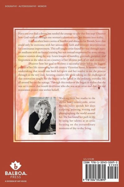 Have you ever had a dream but needed the courage to take that first step? Discover how God worked through one woman's talents to turn her dreams into reality. Life has often been a series of hurdles and obstacles for Brenda Scott that could only be overcome with her unwavering faith and constant determination for continuous improvement. This self-taught artist found her way through many art mediums with no formal training but was instead empowered by many strong, creative women along the way. Learn lessons of humility, gratitude, patience, and forgiveness as she takes us on a journey of her lifetime path of art and creativity. Discover how her goal to become a successful artist led to the biggest project of her life: renovating her old country Victorian home. It became a major undertaking that would test both her spirit and her resolve to see the process through to the very end. Savoring country life while taking on the challenges of that renovation taught her the beauty to be found in the ordinary, everyday life all around her on the acreage. Through this endeavor she began to realize that she was on a course that would determine who she was as an artist and that the real restoration project was within herself.
