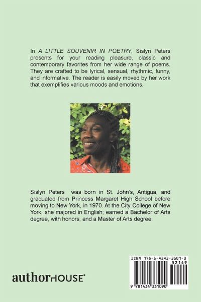 In A Little Souvenir in Poetry, Sislyn Peters selects classic and contemporary favorites from her compilation of poems. This is an intelligently written work, which exposes Peters as a visionary who brings issues to the fore, such as in "The Stoning," "When You Ain't Got Time," and "To A Mother." She makes full use of figures of speech; the reader is not at a loss for sharp imagery. It is obvious that Peters is a literary artist. Her poems have a musical beat, and are sculpted. They are also engrossing, and cause the reader to become engrossed, pause, soul-search, and smile.