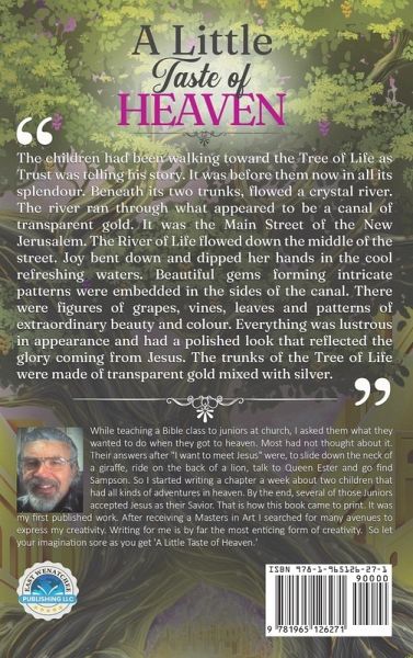 The children had been walking toward the Tree of Life as Trust was telling his story. It was before them now in all its splendour. Beneath its two trunks, flowed a crystal river. The river ran through what appeared to be a canal of transparent gold. It was the Main Street of the New Jerusalem. The River of Life flowed down the middle of the street. Joy bent down and dipped her hands in the cool refreshing waters. Beautiful gems forming intricate patterns were embedded in the sides of the canal. There were figures of grapes, vines, leaves and patterns of extraordinary beauty and colour. Everything was lustrous in appearance and had a polished look that reflected the glory coming from Jesus. The trunks of the Tree of Life were made of transparent gold mixed with silver.