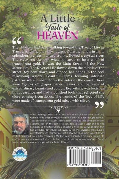 The children had been walking toward the Tree of Life as Trust was telling his story. It was before them now in all its splendour. Beneath its two trunks, flowed a crystal river. The river ran through what appeared to be a canal of transparent gold. It was the Main Street of the New Jerusalem. The River of Life flowed down the middle of the street. Joy bent down and dipped her hands in the cool refreshing waters. Beautiful gems forming intricate patterns were embedded in the sides of the canal. There were figures of grapes, vines, leaves and patterns of extraordinary beauty and colour. Everything was lustrous in appearance and had a polished look that reflected the glory coming from Jesus. The trunks of the Tree of Life were made of transparent gold mixed with silver.
