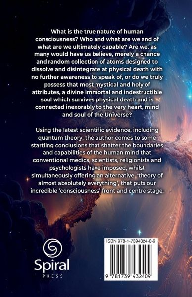 What is the true nature of human consciousness? Who and what are we and of what are we ultimately capable? Are we, as many would have us believe, merely a chance and random collection of atoms designed to dissolve and disintegrate at physical death with no further awareness to speak of, or do we truly possess that most mystical and holy of attributes, a divine immortal and indestructible soul which survives physical death and is connected inexorably to the very heart, mind and soul of the Universe? Using the latest scientific evidence, including quantum theory, the author comes to some startling conclusions that shatter the boundaries and capabilities of the human mind that conventional medics, scientists, religionists and psychologists have imposed, whilst simultaneously offering an alternative 'theory of almost absolutely everything', that puts our incredible 'consciousness' front and centre stage.