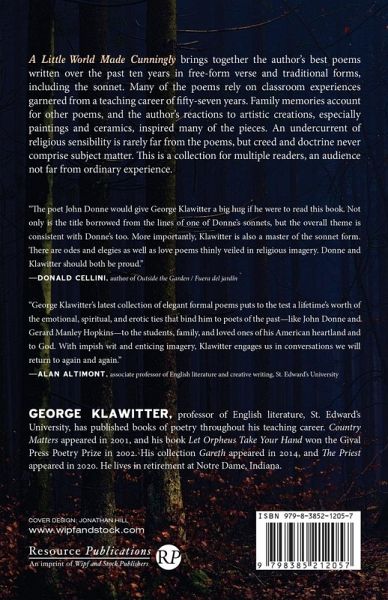 A Little World Made Cunningly brings together the author's best poems written over the past ten years in free-form verse and traditional forms, including the sonnet. Many of the poems rely on classroom experiences garnered from a teaching career of fifty-seven years. Family memories account for other poems, and the author's reactions to artistic creations, especially paintings and ceramics, inspired many of the pieces. An undercurrent of religious sensibility is rarely far from the poems, but creed and doctrine never comprise subject matter. This is a collection for multiple readers, an audience not far from ordinary experience.