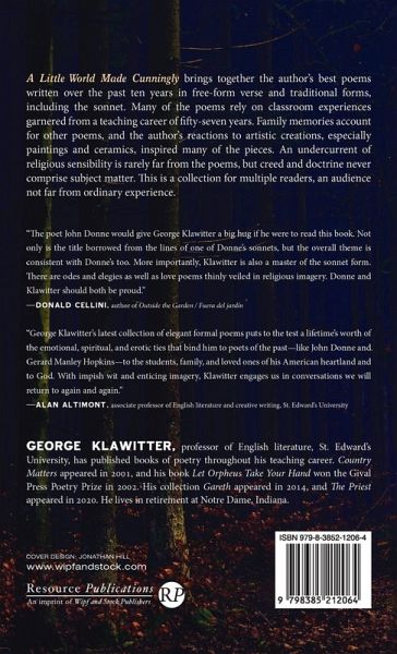 A Little World Made Cunningly brings together the author's best poems written over the past ten years in free-form verse and traditional forms, including the sonnet. Many of the poems rely on classroom experiences garnered from a teaching career of fifty-seven years. Family memories account for other poems, and the author's reactions to artistic creations, especially paintings and ceramics, inspired many of the pieces. An undercurrent of religious sensibility is rarely far from the poems, but creed and doctrine never comprise subject matter. This is a collection for multiple readers, an audience not far from ordinary experience.