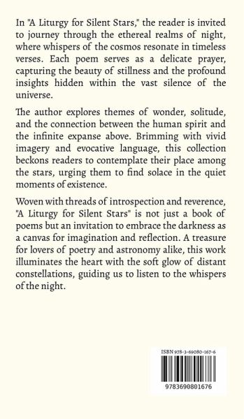 In "A Liturgy for Silent Stars," the reader is invited to journey through the ethereal realms of night, where whispers of the cosmos resonate in timeless verses. Each poem serves as a delicate prayer, capturing the beauty of stillness and the profound insights hidden within the vast silence of the universe. The author explores themes of wonder, solitude, and the connection between the human spirit and the infinite expanse above. Brimming with vivid imagery and evocative language, this collection beckons readers to contemplate their place among the stars, urging them to find solace in the quiet moments of existence. Woven with threads of introspection and reverence, "A Liturgy for Silent Stars" is not just a book of poems but an invitation to embrace the darkness as a canvas for imagination and reflection. A treasure for lovers of poetry and astronomy alike, this work illuminates the heart with the soft glow of distant constellations, guiding us to listen to the whispers of the night.