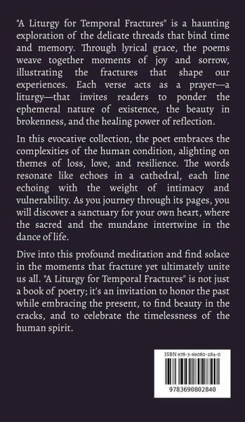 "A Liturgy for Temporal Fractures" is a haunting exploration of the delicate threads that bind time and memory. Through lyrical grace, the poems weave together moments of joy and sorrow, illustrating the fractures that shape our experiences. Each verse acts as a prayer-a liturgy-that invites readers to ponder the ephemeral nature of existence, the beauty in brokenness, and the healing power of reflection. In this evocative collection, the poet embraces the complexities of the human condition, alighting on themes of loss, love, and resilience. The words resonate like echoes in a cathedral, each line echoing with the weight of intimacy and vulnerability. As you journey through its pages, you will discover a sanctuary for your own heart, where the sacred and the mundane intertwine in the dance of life. Dive into this profound meditation and find solace in the moments that fracture yet ultimately unite us all. "A Liturgy for Temporal Fractures" is not just a book of poetry; it's an invitation to honor the past while embracing the present, to find beauty in the cracks, and to celebrate the timelessness of the human spirit.