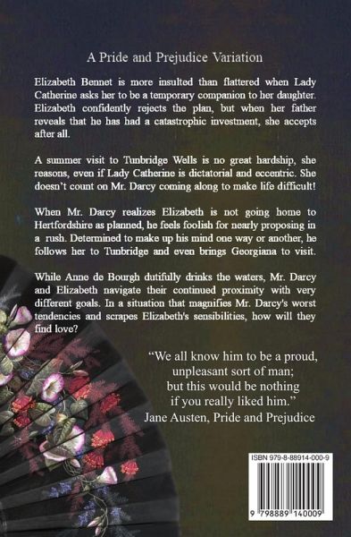 A variation of Pride and Prejudice, bringing your favorite romantic couple together in a whole new way! Elizabeth Bennet is more insulted than flattered when Lady Catherine asks her to be a temporary companion to her daughter. Elizabeth confidently rejects the plan, but when her father reveals that he has had a catastrophic investment, she accepts after all. A summer visit to Tunbridge Wells is no great hardship, she reasons, even if Lady Catherine is dictatorial and eccentric. She doesn't count on Mr. Darcy accompanying them... When Mr. Darcy realizes Elizabeth is not going home to Hertfordshire as planned, he feels foolish for nearly proposing in a rush. Determined to make up his mind one way or another, he makes efforts to know Elizabeth better over the summer. While Anne de Bourgh dutifully drinks the waters of Tunbridge, Mr. Darcy and Elizabeth navigate their continued proximity with very different goals. In a situation that magnifies Mr. Darcy's worst tendencies and scrapes Elizabeth's sensibilities raw, how will they find love? It's a summer trip full of unexpected attraction, conniving relatives, and emotional revelations.