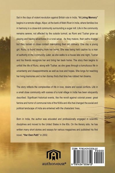 Set in the days of violent revolution against British rule in India, "A Living Memory" begins in a remote village, Alipur, at the bank of Mahi River in India, where families live in harmony in a close-knit community surrounding a sugar mill. Life in the community remains serene, not affected by the outside turmoil, as Romi and Tushar grow up playing and having adventures in a rural setup. As they mature, their paths diverge but they remain in close contact maintaining their old intimacy. One day a young girl, Runu, is found missing from her home. She was being held captive by a man of authority in the community. Later, as she walks to a house late one night, Tushar and his friends recognize her and bring her back home. The story then begins to unfold the life of Runu, along with Tushar, as she goes through a tumultuous life in uncertainty and disappointments as well as love and hopes. She longs for reaching her living memories and to her dismay finds that time has robbed her dreams. The story reflects the complexities of life in love, desire and social conflicts. Life in a small close community with scenes of a rural village in India has been eloquently described. Significant historical events, like the revolt against colonial power, great famine and horror of communal riots of the1930s and 40s that changed the social and political landscape of India are entwined with the characters' lives. Born in India, the author was educated and professionally engaged in scientific disciplines and moved to the United States in the 60s. On the literary side, he has written many short stories and essays for various magazines and published his first novel, "Her Own Path" in 2002.