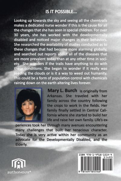 Looking up towards the sky and seeing all the chemtrails makes a dedicated nurse wonder if this is the cause for all the changes that she has seen in special children. For over 30 years, she has worked with the developmentally disabled and noticed major changes in their behaviors. She researched the availability of studies conducted as to these changes that had become more alarming globally, and searched out reports about all of the diseases that are more prevalent today than at any other time in society. She wonders if the trails have anything to do with these conditions. She began to wonder if it really was seeding the clouds or is it a way to weed out humanity. This could be a form of population control with chemicals raining down on the earth altering lives forever.