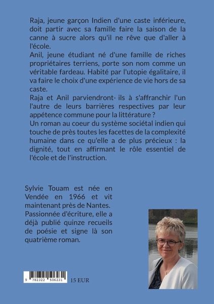 Raja, jeune garçon Indien d'une caste inférieure, doit partir avec sa famille faire la saison de la canne à sucre alors qu'il ne rêve que d'aller à l'école.Anil, jeune étudiant né d'une famille de riches propriétaires terriens, porte son nom comme un véritable fardeau. Habité par l'utopie égalitaire, il va faire le choix d'une expérience de vie hors de sa caste.Raja et Anil parviendront-ils à s'affranchir l'un l'autre de leurs barrières respectives par leur appétence commune pour la littérature ?Un roman au coeur du système sociétal indien qui touche de près toutes les facettes de la complexité humaine dans ce qu'elle a de plus précieux : la dignité, tout en affirmant le rôle essentiel de l'école et de l'instruction.