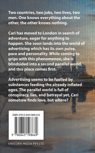 Two countries, two jobs, two lives, two men. One knows everything about the other, the other knows nothing. Cari has moved to London in search of adventure, eager for anything to happen. She soon lands into the world of advertising which has its own pulse, pace and personality. While coming to grips with this phenomenon, she is blindsided into a second parallel world, and this place comes first. Advertising seems to be fuelled by substances feeding the already inflated egos. The parallel world is full of conspiracy, lies, and betrayal yet, Cari somehow finds love, but where?