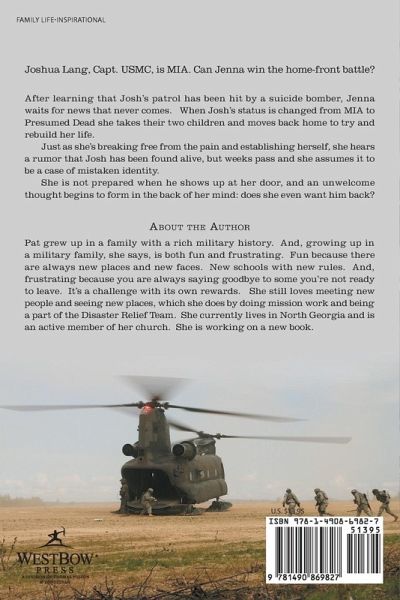 Joshua Lang, Capt. USMC, is MIA. Can Jenna win the home-front battle? After learning that Josh's patrol has been hit by a suicide bomber, Jenna waits for news that never comes. When Josh's status is changed from MIA to Presumed Dead she takes their two children and moves back home to try and rebuild her life. Just as she's breaking free from the pain and establishing herself, she hears a rumor that Josh has been found alive, but weeks pass and she assumes it to be a case of mistaken identity. She is not prepared when he shows up at her door, and an unwelcome thought begins to form in the back of her mind: does she even want him back?