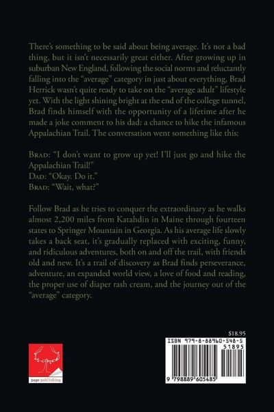 There's something to be said about being average. It's not a bad thing, but it isn't necessarily great either. After growing up in suburban New England, following the social norms and reluctantly falling into the "average" category in just about everything, Brad Herrick wasn't quite ready to take on the "average adult" lifestyle yet. With the light shining bright at the end of the college tunnel, Brad finds himself with the opportunity of a lifetime after he made a joke comment to his dad: a chance to hike the infamous Appalachian Trail. The conversation went something like this: Brad: "I don't want to grow up yet! I'll just go and hike the Appalachian Trail!" Dad: "Okay. Do it." Brad: "Wait, what?" Follow Brad as he tries to conquer the extraordinary as he walks almost 2,200 miles from Katahdin in Maine through fourteen states to Springer Mountain in Georgia. As his average life slowly takes a back seat, it's gradually replaced with exciting, funny, and ridiculous adventures, both on and off the trail, with friends old and new. It's a trail of discovery as Brad finds perseverance, adventure, an expanded world view, a love of food and reading, the proper use of diaper rash cream, and the journey out of the "average" category.