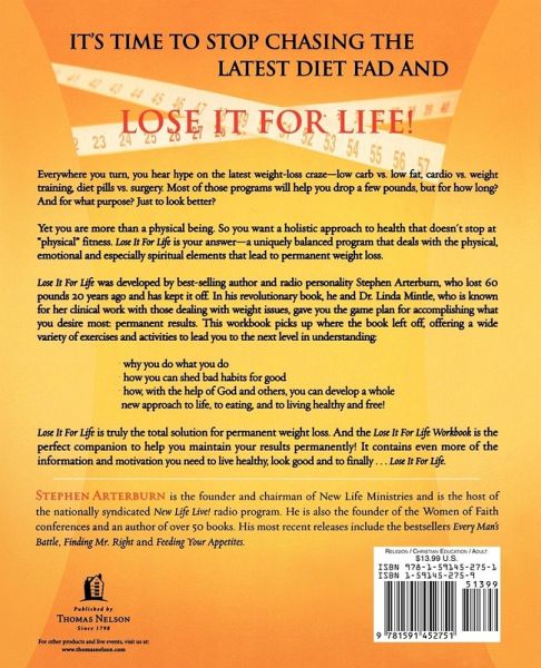 Everywhere you turn, you hear hype on the latest weight-loss craze--low carb vs. low fat, cardio vs. weight training, diet pills vs. surgery. Most of those programs will help you drop a few pounds, but for how long? And for what purpose? Just to look better? Yet you are more than a physical being. You want a holistic approach to health that doesn't stop at "physical" fitness. Lose It For Life is your answer--a uniquely balanced program that deals with the physical, emotional, and especially the spiritual elements that lead to permanent weight loss. Lose It For Life was developed by best-selling author and radio personality, Stephen Arterburn, who lost 60 pounds 20 years ago and has kept it off. In his revolutionary book, he and Dr. Linda Mintle, who is known for her clinical work with those dealing with weight issues, gave you the game plan for accomplishing what you desire most: permanent results. This workbook picks up where the book left off, offering a wide variety of exercises and activities to lead you to the next level in understanding why you do what you do, how you can shed bad habits for good, and how, with the help of God and others, you can develop a whole new approach to life, to eating, and to living healthy and free! Lose It For Life is truly the total solution for permanent weight loss. And the Lose It For Life Workbook is the perfect companion to help you maintain your results permanently! It contains even more of the information and motivation you need to live healthy, look good, and to finally . . . Lose It For Life!