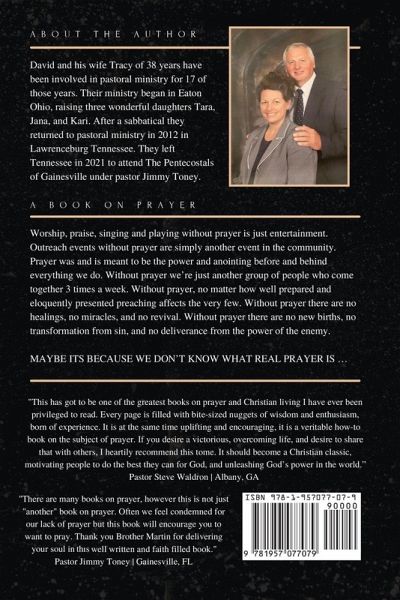 Worship, praise, singing and playing without prayer is just entertainment. Outreach events without prayer are simply another event in the community. Prayer was and is meant to be the power and anointing before and after everything we do. Without prayer there are no new births, no transformation from sin, and no deliverance from the power of the enemy. Maybe it's because we don't know what real prayer is. My desire is that you will glean something from these pages that will help you in your Christian experience in prayer!