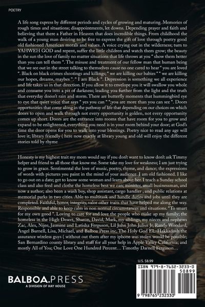 A life song express by different periods and cycles of growing and maturing. Memories of rough times and situations; disappointments, let downs. Depending prayer and faith and believing that there a Father in Heaven that does incredible things. From childhood the walk of a young man desiring to be free to express the gift of love through poetry good old fashioned American morals and values. A voice crying out in the wilderness; turn to YAHWEH GOD and repent, suffer the little children and watch them grow; the beauty in the sun the love of family no matter situations that life throws at you " show them better than you can tell them ". The misuse and treatment of our fellow man that human being that we see out in the street talking to themselves cause no one cared to hear " you are loved ". Black on black crimes shootings and killings; " we are killing our babies " " we are killing our hopes, dreams, maybes ". " I am Black ". Depression is something we all experience and life takes us in that direction. If you allow it to envelope you it will swallow you whole and consume you into a pit of darkness; leading you further from the light and the truth that everyday doesn't rain and storm. There are butterfly moments that hummingbird eye to eye that quiet voice that says " yes you can " ";you are more than you can see ". Doors opportunities that come along in the pathway of life that depending on our choices on which doors to open and walk through not every opportunity is golden, not every opportunity comes up short. Doors are the entrance into rooms that have room for you to grow and expand to be enlightened, everything you need is in your room behind your door; at God's time the door opens for you to walk into your blessings. Poetry nice to read any age will love it; library friendly ( here now exactly at library young and old will enjoy the different stories told by rhyme