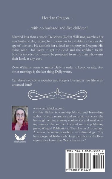 Head to Oregon... ...with no husband and five children? Married less than a week, Delicious (Delly) Williams, watches her new husband die, leaving her to raise his five children all under the age of thirteen. He also left her a deed to property in Oregon. His dying wish...for Delly to get the deed and the children to his brother in order for them to be protected from the man who wants their land, at any cost. Zeke Williams wants to marry Delly in order to keep her safe. Another marriage is the last thing Delly wants. Can these two come together and forge a love and a new life in an untamed land?