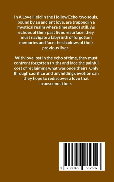 In A Love Held in the Hollow Echo, two souls bound by a love long forgotten must face the depths of an ancient realm to uncover the truth of their past-and the future of their hearts. When Veyrina Lioris is pulled into a mystical realm, she discovers her soul is inexplicably tied to a woman she's never met: Elyndra Varell. Their connection pulses through the fabric of this strange world, a love long buried, yet undying. As the echo of their past life reverberates through time, they are forced to navigate a labyrinth of twisted memories and forgotten truths. The deeper they venture, the more they unravel-unlocking secrets that threaten not only their love but the very fabric of the realm itself. With each step, the echo grows louder, pulling them closer to the truth of their past and the sacrifice that may be required to survive. Will they be able to break the cycle of the echo, or will they lose each other forever in the pursuit of a love that transcends time? With breathtaking twists, heart-wrenching decisions, and a love story that defies the ages, A Love Held in the Hollow Echo is a gripping tale of fate, sacrifice, and the powerful bond that exists beyond the boundaries of time. Buy this book now and dive into a world where love and memory collide in a battle for the soul!
