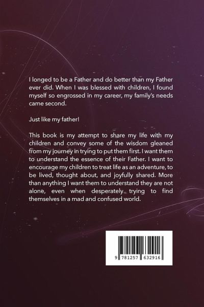 I longed to be a Father and do better than my Father ever did. When I was blessed with children, I found myself so engrossed in my career, my family's needs came second. Just like my father! This book is my attempt to share my life with my children and convey some of the wisdom gleaned from my journey in trying to put them first. I want them to understand the essence of their Father. I want to encourage my children to treat life as an adventure, to be lived, thought about, and joyfully shared. More than anything I want them to understand they are not alone, even when desperately trying to find themselves in a mad and confused world.
