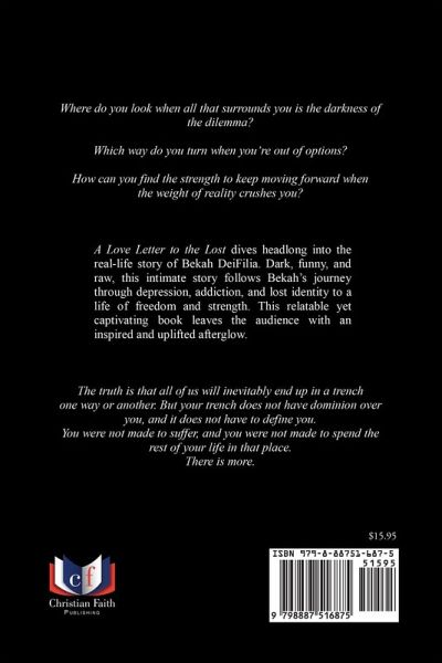 Where do you look when all that surrounds you is the darkness of the dilemma? Which way do you turn when you're out of options? How can you find the strength to keep moving forward when the weight of reality crushes you? A Love Letter to the Lost dives headlong into the real-life story of Bekah DeiFilia. Dark, funny, and raw, this intimate story follows Bekah's journey through depression, addiction, and lost identity to a life of freedom and strength. This relatable yet captivating book leaves the audience with an inspired and uplifted afterglow. The truth is that all of us will inevitably end up in a trench one way or another. But your trench does not have dominion over you, and it does not have to define you. You were not made to suffer, and you were not made to spend the rest of your life in that place. There is more.