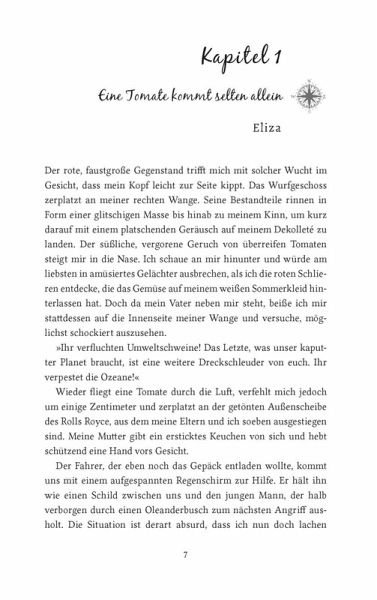Die Handlung hat mir sehr gut gefallen. Es gab einige kleinere und größere Konflikte und überraschende Wendungen. Mich hat es durchweg im Buch gehalten und ich bin durch die Seiten geflogen. Die Liebesgeschichte fand ich sehr gelungen und authentisch. Für mich hat es sich gut angefühlt, wie sich die beiden langsam und emotional immer näher gekommen sind. Besonders schön fand ich die Parallelen zu Szenen von dem Film Titanic. Ich mochte den Ausflug auf der Insel. Es ist zum Teil romantisch, aber auf keinen Fall kitschig und es gibt immer mal wieder Momente, die einen schmunzeln lassen. Aber auch Elizas Liebe zur Natur ist immer wieder deutlich geworden. Mir hat die Szene mit den Stachelrochen total gut gefallen. Die gewählten Themen fand ich interessant und gut bearbeitet und das Ende fand ich super gelungen und es hat so gut gepasst.