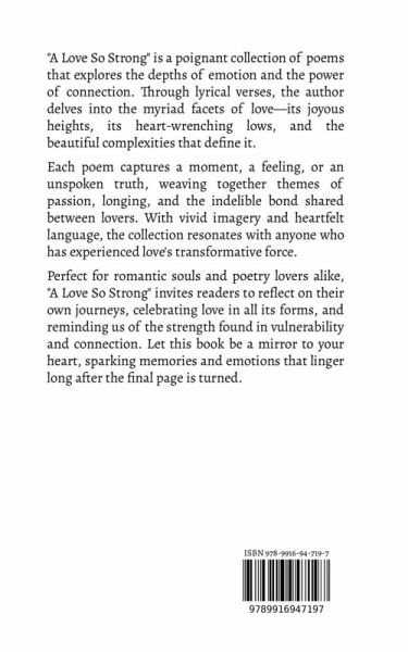 "A Love So Strong" is a poignant collection of poems that explores the depths of emotion and the power of connection. Through lyrical verses, the author delves into the myriad facets of love-its joyous heights, its heart-wrenching lows, and the beautiful complexities that define it. Each poem captures a moment, a feeling, or an unspoken truth, weaving together themes of passion, longing, and the indelible bond shared between lovers. With vivid imagery and heartfelt language, the collection resonates with anyone who has experienced love's transformative force. Perfect for romantic souls and poetry lovers alike, "A Love So Strong" invites readers to reflect on their own journeys, celebrating love in all its forms, and reminding us of the strength found in vulnerability and connection. Let this book be a mirror to your heart, sparking memories and emotions that linger long after the final page is turned.