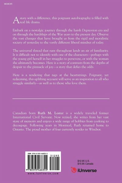 A story with a difference, this poignant autobiography is filled with real life drama. Embark on a nostalgic journey through the harsh Depression era and on through the hardships of the War years to the present day. Observe the vast changes that have brought us from the rigid and moralistic society of yesterday to the vastly different liberal mindset of today. The universal thread that runs throughout lends an air of familiarity. It is difficult not to identify with one of the characters-perhaps with the young girl herself in her struggles to persevere, or with the woman she ultimately becomes. Here is a story of contrasts from the depths of despair to the pinnacle of joy-a story that defies the odds. Here is a rendering that tugs at the heartstrings. Poignant, yet redeeming, this uplifting account will serve as an inspiration to all who struggle similarly-as well as to those who love them.