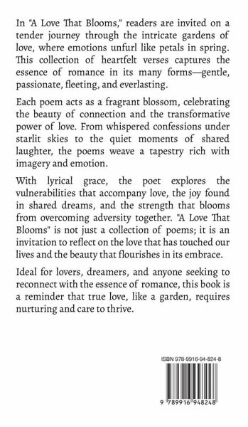 In "A Love That Blooms," readers are invited on a tender journey through the intricate gardens of love, where emotions unfurl like petals in spring. This collection of heartfelt verses captures the essence of romance in its many forms-gentle, passionate, fleeting, and everlasting. Each poem acts as a fragrant blossom, celebrating the beauty of connection and the transformative power of love. From whispered confessions under starlit skies to the quiet moments of shared laughter, the poems weave a tapestry rich with imagery and emotion. With lyrical grace, the poet explores the vulnerabilities that accompany love, the joy found in shared dreams, and the strength that blooms from overcoming adversity together. "A Love That Blooms" is not just a collection of poems; it is an invitation to reflect on the love that has touched our lives and the beauty that flourishes in its embrace. Ideal for lovers, dreamers, and anyone seeking to reconnect with the essence of romance, this book is a reminder that true love, like a garden, requires nurturing and care to thrive.