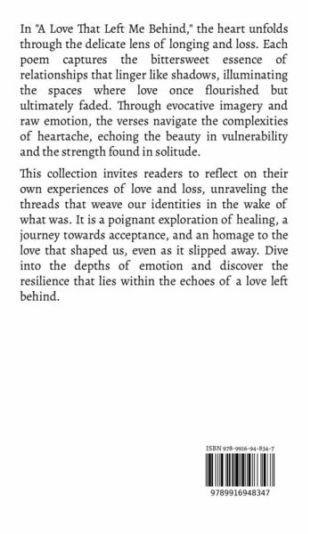 In "A Love That Left Me Behind," the heart unfolds through the delicate lens of longing and loss. Each poem captures the bittersweet essence of relationships that linger like shadows, illuminating the spaces where love once flourished but ultimately faded. Through evocative imagery and raw emotion, the verses navigate the complexities of heartache, echoing the beauty in vulnerability and the strength found in solitude. This collection invites readers to reflect on their own experiences of love and loss, unraveling the threads that weave our identities in the wake of what was. It is a poignant exploration of healing, a journey towards acceptance, and an homage to the love that shaped us, even as it slipped away. Dive into the depths of emotion and discover the resilience that lies within the echoes of a love left behind.