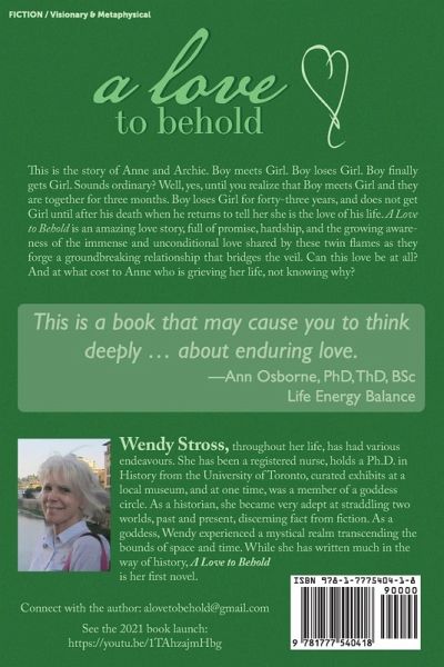 After a brief intense romance, Archie ghosts Anne-forty-three years later, Archie returns to tell Anne, that she is the love of his life. He's dead. And then, he simply moves into Anne's life, a world in which she is already struggling, feeling despair. Archie explains that he and Anne are twin flames, two halves of the same soul, and that with his death, their soul contract that spanned hundreds of lifetimes is complete, with one exception. They had promised to write their love story. What love story?! They had dated a mere three months. This is the story of Anne and Archie as they come together, recall their deep love for each other, and forge a ground-breaking relationship that bridges the veil and is in two worlds, one that allows them to recall, reflect, and write their love story, the one in the past, and the one that continues. Sounds easy? Well, no, there's no map yet. Scattered throughout this narrative are letters, dreams, excerpts from Anne's Irish journal, and snippets of conversation from the couple's personal journals. They serve two purposes: to ground this love and relationship in Anne's life, her world, her journey through grief to self-love; and to offer a first-hand glimpse of the love, the humour, the magic, as Anne and Archie venture forth into unchartered territory and discover for themselves how truly profound their connection is, in both worlds. For those who have loved and lost, A Love to Behold opens the door to unexplored possibilities of love and connection that transcend the bounds of space and time. That transcend death. That it is possible to keep loving at all levels, and have that love transformed and transformative.
