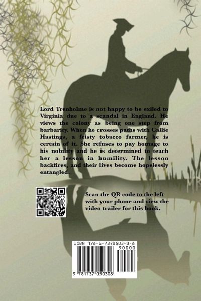 Lord Jonathan Trenholme is not happy about being exiled to the colony of Virginia until a scandal in England blows over. Accustomed to wealth, power, and privilege, he views the colonies as being one step from barbarism. When he crosses paths with Callie Hastings, a feisty, illiterate tobacco farmer who refuses to pay homage to his noble birth, he is certain of it. Outwitted by her one time too many, Trenholme is determined to teach her a lesson in humility. Instead, she ends up in his custody to both their dismay. In her reversal of circumstances, the headstrong Callie manages to upset the powerful Burgesses of the town and anger the Royal Governor's Court, forcing Trenholme to come to her defense. In time, they come to a mutual understanding and Callie learns trust; Lord Jon learns respect; and both learn love as their hearts become unexpectedly and hopelessly entwined.