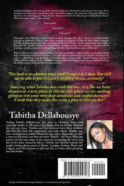 Anthony finally has the woman of his dreams in his arms for the first time in over ten years. He is desperate to make this moment last and is not above going to the extremes. Everyone will have a first love, but what happens when the love burns out? How far will you go to rekindle the flame? When the ashes settle . . . How do you: Trust again? Lust again? Love again? Alexander and Olivia have worked hard on their marriage but Alex's choice to remain friends with an ex-girlfriend, Felecia, puts their marriage in jeopardy while his wife Olivia struggles with her feelings for her first love, Anthony. Paul and LaNette - an interracial couple have built a beautiful life together but Paul secretly struggles to gain his mother's approval of this marriage and his actions are slowly pushing his wife away. A Love Unfulfilled brings to life how strong desire and unrequited love can be and its impact on these couples over the course of seven days.