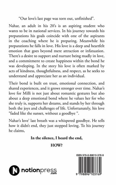 "Our love's last page was torn out, unfinished". Nahar, an adult in his 20's is an aspiring student who wants to be in national services. In his journey towards his preparations his goals coincide with one of the aspirants in the coaching where he is preparing. Meanwhile his preparations he falls in love. His love is a deep and heartfelt emotion that goes beyond mere attraction or infatuation. There's a desire to support and nurture being madly in love, and a commitment to create happiness within the bond he was developing. In the story his love is often marked by acts of kindness, thoughtfulness, and respect, as he seeks to understand and appreciate her as an individual. Their bond is built on trust, emotional connection, and shared experiences, and it grows stronger over time. Nahar's love for Milli is not just about romantic gestures but also about a deep emotional bond where he values her for who she truly is, supports her dreams, and stands by her through both the joys and challenges of life. Unfortunately, his love "faded like the sunset, without a goodbye ". Nahar's love' last breath was a whispered goodbye. He tells how it didn't end, they just stopped loving. To his journey he claims, In the silence, I heard the end, HOW?