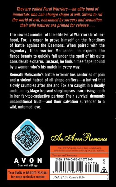 They are called Feral Warriors?an elite band of immortals who can change shape at will. Sworn to rid the world of evil, consumed by sorcery and seduction, their wild natures are primed for release . . . The newest member of the elite Feral Warriors brotherhood, Fox is eager to prove himself on the frontlines of battle against the Daemons. When paired with the legendary Ilina warrior Melisande, he expects the fierce beauty to quickly fall under the spell of his quite considerable charm. Instead, he finds himself spellbound by a woman who's his match in every way. Beneath Melisande's brittle exterior lies centuries of pain and a violent hatred of all shape-shifters?a hatred that slowly crumbles after she and Fox are caught in a deadly and cunning Mage trap and she glimpses a surprising depth in her far-too-seductive partner. Their survival demands unconditional trust?and their salvation surrender to a wild, untamed love.