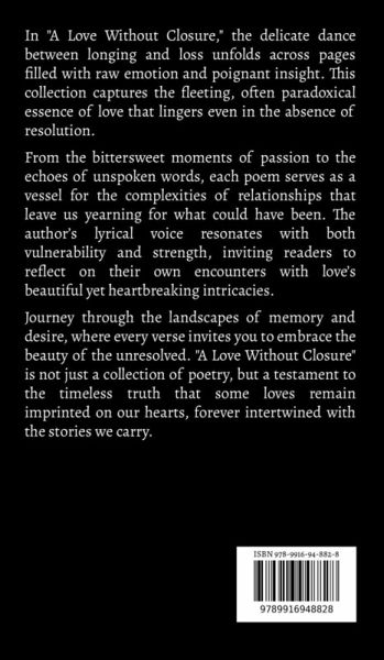 In "A Love Without Closure," the delicate dance between longing and loss unfolds across pages filled with raw emotion and poignant insight. This collection captures the fleeting, often paradoxical essence of love that lingers even in the absence of resolution. From the bittersweet moments of passion to the echoes of unspoken words, each poem serves as a vessel for the complexities of relationships that leave us yearning for what could have been. The author's lyrical voice resonates with both vulnerability and strength, inviting readers to reflect on their own encounters with love's beautiful yet heartbreaking intricacies. Journey through the landscapes of memory and desire, where every verse invites you to embrace the beauty of the unresolved. "A Love Without Closure" is not just a collection of poetry, but a testament to the timeless truth that some loves remain imprinted on our hearts, forever intertwined with the stories we carry.