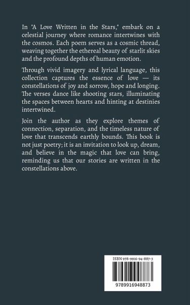 In "A Love Written in the Stars," embark on a celestial journey where romance intertwines with the cosmos. Each poem serves as a cosmic thread, weaving together the ethereal beauty of starlit skies and the profound depths of human emotion. Through vivid imagery and lyrical language, this collection captures the essence of love - its constellations of joy and sorrow, hope and longing. The verses dance like shooting stars, illuminating the spaces between hearts and hinting at destinies intertwined. Join the author as they explore themes of connection, separation, and the timeless nature of love that transcends earthly bounds. This book is not just poetry; it is an invitation to look up, dream, and believe in the magic that love can bring, reminding us that our stories are written in the constellations above.