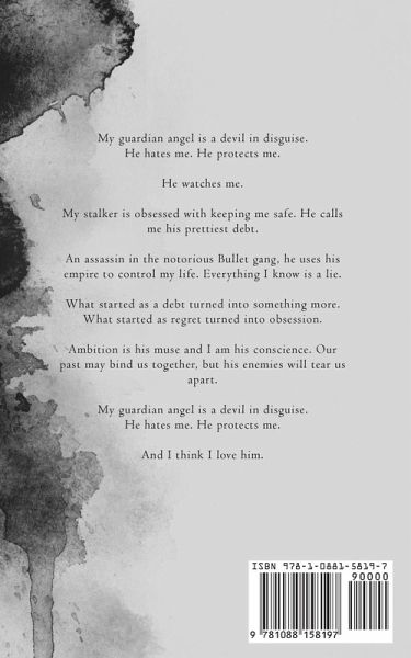 My guardian angel is a devil in disguise. He hates me. He protects me. He watches me. My stalker is obsessed with keeping me safe. He calls me his prettiest debt. An assassin in the notorious Bullet gang, he uses his empire to control my life. Everything I know is a lie. What started as a debt turned into something more. What started as regret turned into obsession. Ambition is his muse and I am his conscience. Our past may bind us together, but his enemies will tear us apart. My guardian angel is a devil in disguise. He hates me. He protects me. And I think I love him.