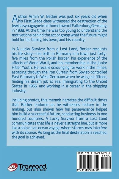Author Armin W. Becker was just six years old when his kindergarten class witnessed the destruction of the Jewish synagogue in his hometown of Falkenburg, Germany, in 1938. At the time, he was too young to understand the motivations behind the act or grasp what the future might hold for his family, his town, and his country. In A Lucky Survivor from a Lost Land, Becker recounts his life story-his birth in Germany in a town just forty-five miles from the Polish border, his experience of the affects of World War II, and his membership in the Junior Hitler Youth. He recalls scrounging for work in the mines, escaping through the Iron Curtain from Soviet-controlled East Germany to West Germany when he was nearly fifteen, finding his dream job at sea, immigrating to the United States in 1956, and working in a career in the shipping industry. Including photos, this memoir narrates the difficult times that Becker endured as he witnesses history in the making, but also shows how his perseverance helped him build a successful future, conducting business in one hundred countries. A Lucky Survivor from a Lost Land communicates that life is never a straight line, but is more like a ship on an ocean voyage where storms may interfere with its course. As long as the final destination is reached, the goal is achieved.