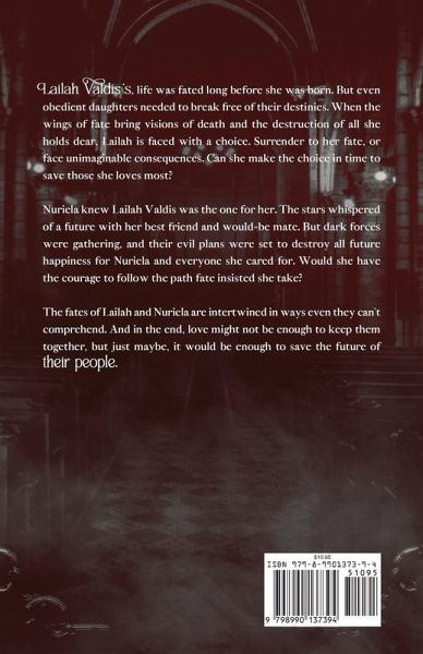 Lailah Valdis's life was fated long before she was born. But even obedient daughters needed to break free of their destinies. When the wings of fate bring visions of death and the destruction of all she holds dear, Lailah is faced with a choice. Surrender to her fate, or face unimaginable consequences. Can she make the choice in time to save those she loves most? Nuriela knew Lailah Valdis was the one for her. The stars whispered of a future with her best friend and would-be mate. But dark forces were gathering, and their evil plans were set to destroy all future happiness for Nuriela and everyone she cared for. Would she have the courage to follow the path fate insisted she take? The fates of Lailah and Nuriela are intertwined in ways even they can't comprehend. And in the end, love might not be enough to keep them together, but just maybe, it would be enough to save the future of their people. This novella is a prequel, but best read after Resurrection.