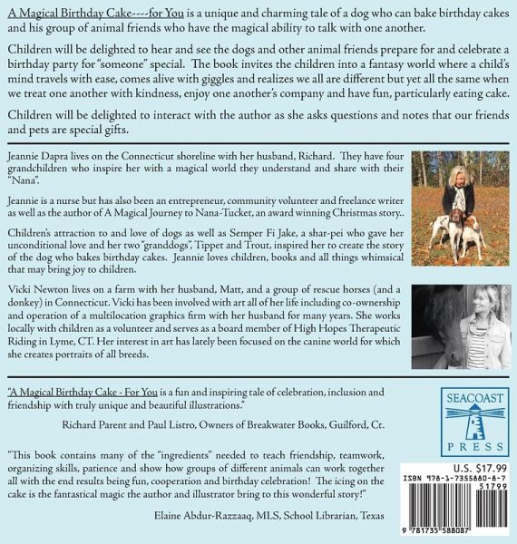 A Magical Birthday Cake----for You is a unique and charming tale of a dog who can bake birthday cakes and his group of animal friends who have the magical ability to talk with one another. Children will be delighted to hear and see the dogs and other animal friends prepare for and celebrate a birthday party for “someone” special. The book invites the children into a fantasy world where a child’s mind travels with ease, comes alive with giggles and realizes we all are different but yet all the same when we treat one another with kindness, enjoy one another’s company and have fun, particularly eating cake. Children will be delighted to interact with the author as she asks questions and notes that our friends and pets are special gifts.