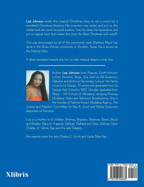 Lisa Johnson wrote this magical Christmas story to set a mood for a wonderful Christmas blessing. Her invention was stolen and put on the market, and she never received a penny. Lisa has taken her experience and put a magical twist that makes this story the best Christmas wish ever! She was encouraged by all of the community work Mattress Mack has done in the Acres Homes community in Houston, Texas. He is known as the helping Hero. It takes wonderful people like him to help magical dreams come true.