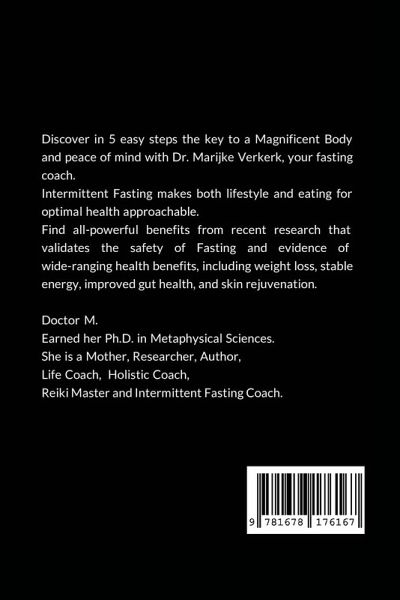 Discover in 5 easy steps the key to a Magnificent Body and peace of mind with Dr. Marijke Verkerk, your fasting coach. Intermittent Fasting makes both lifestyle and eating for optimal health approachable. Find all-powerful benefits from recent research that validates the safety of Fasting and evidence of wide-ranging health benefits, including weight loss, stable energy, improved gut health, and skin rejuvenation.