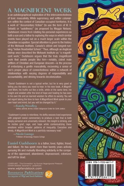 A Magnificent Work is an autobiographical exploration of the interconnectedness of toxic masculinity, White supremacy, and settler colonialism within the context of Canadian-occupied territories. It is a work of ""documentary fiction"" (to use the term of W. G. Sebald) or ""autotheory"" (as proposed by Maggie Nelson). Oudshoorn moves from relating his personal experiences as both a son and a father to exploring the ways in which similar events have played out on a much larger scale within the Canadian occupation. Special attention is given to the history of the Mohawk Institute, Canada's oldest and longest-running ""Indian Residential School."" Thus, although an Anglican bishop once described the Mohawk Institute as ""a magnificent work,"" Oudshoorn argues that the truly magnificent work that awaits people like him--notably, cishet male settlers of Christian and European descent--is the process of embodying a gentle masculinity, recovering a sense of one's proper place of connectedness within a network of relationships with varying degrees of responsibility and accountability, and striving towards decolonization.