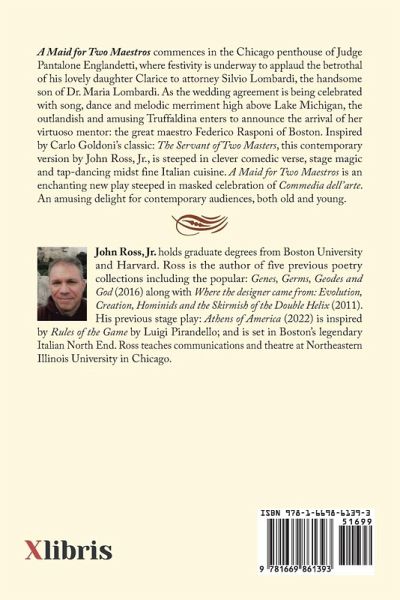 A Maid for Two Maestros commences in the Chicago penthouse of Judge Pantalone Englandetti, where festivity is underway to applaud the betrothal of his lovely daughter Clarice to attorney Silvio Lombardi, the handsome son of Dr. Maria Lombardi. As the wedding agreement is being celebrated with song, dance and melodic merriment high above Lake Michigan, the outlandish and amusing Truffaldina enters to announce the arrival of her virtuoso mentor: the great maestro Federico Rasponi of Boston. Inspired by Carlo Goldoni's classic: The Servant of Two Masters, this contemporary version by John Ross, Jr., is steeped in clever comedic verse, stage magic and tap-dancing midst fine Italian cuisine. A Maid for Two Maestros is an enchanting new play steeped in masked celebration of Commedia dell'arte. An amusing delight for contemporary audiences, both old and young.