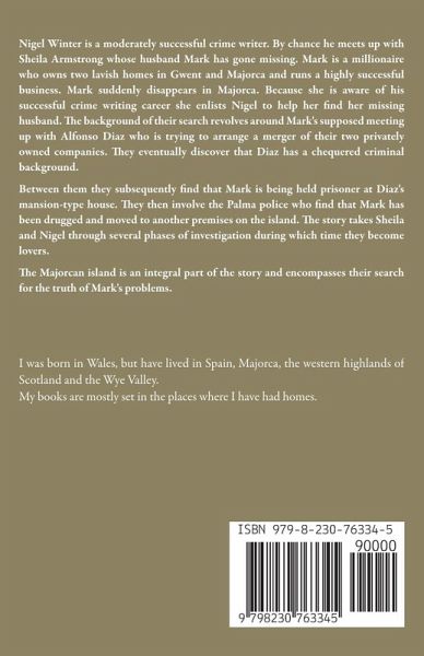 Nigel Winter is a moderately successful crime writer. By chance he meets up with Sheila Armstrong whose husband Mark has gone missing. Mark is a millionaire who owns two lavish homes in Gwent and Majorca and runs a highly successful business. Mark suddenly disappears in Majorca. Because she is aware of his successful crime writing career she enlists Nigel to help her find her missing husband. The background of their search revolves around Mark's supposed meeting up with Alfonso Diaz who is trying to arrange a merger of their two privately owned companies. They eventually discover that Diaz has a chequered criminal background. Between them they subsequently find that Mark is being held prisoner at Diaz's mansion-type house. They then involve the Palma police who find that Mark has been drugged and moved to another premises on the island. The story takes Sheila and Nigel through several phases of investigation during which time they become lovers. The Majorcan island is an integral part of the story and encompasses their search for the truth of Mark's problems.