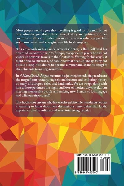 Most people would agree that travelling is good for the soul. It not only educates you about the culture, history and politics of other countries, it allows you to become more tolerant of others, appreciate your home more, and may give your life fresh purpose. At a crossroads in his career, accountant Angus Rich followed his dream of an extended trip to Europe, to experience places he had not visited in previous travels to the Continent. Waiting for his very last flight home to Australia, he had somewhat of an epiphany. Why not pursue a long-held desire to become a writer and share his insights about his solo travelling adventure? In A Man Abroad, Angus recounts his journey, introducing readers to the magnificent scenery, majestic architecture and enduring history of many of Europe’s cities and landmarks. We are swept along with him as he experiences the highs and lows of modern day travel, from meeting memorable people and making new friends, to lost luggage and officious airport staff. This book is for anyone who has ever been bitten by wanderlust or has a yearning to learn about new destinations, taste unfamiliar foods, experience diverse cultures and meet interesting people.